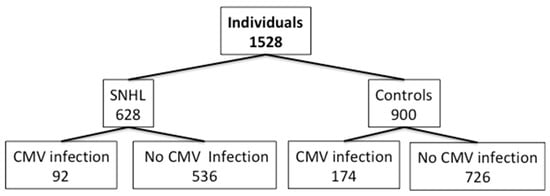 Most of the studies were conducted in children of few years of age, although it was observed that patients with acquired CMV infection (children or adults) could potentially present hearing loss independently of the age group. The records were classified according to the age of the included patients, as children (age below 14 years old; n = 1172) and adults (age above 14 years; n = 139). In one study, this information was not specified (n = 217) [30]. Among the 1528 individual (628 SNHL patients and 900 controls), only 92 suffered from SNHL after acquired CMV infection; however, none of 174 individuals with acquired CMV infection presented SNHL (Figure 2).