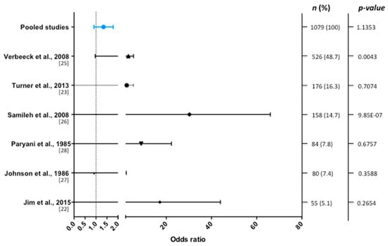 Forest plot of the selected studies showing odds ratios with 95% confidence intervals. Pooled data (blue line) from 1079 individuals show no significant association between CMV infection and hearing loss.