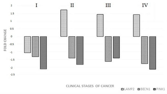 This research is a continuation of earlier studies in which microarray analysis was used to analyze the expression profile of 435 miRNAs related to autophagy in colorectal cancer. Of the 50 statistically significant genes, the three most important that are involved in the regulation of autophagy were selected. Each participates in a different type of autophagy: macrophagy—BECN1, chaperone-dependent autophagy—LAMP2, and mitophagy—PINK1. Changes in the transcriptional activity of the BECN1 indicated a decreased expression of this gene in all cancer clinical stages (CSI–CSIV). LAMP2 expression was reduced only in CSI, while in CSII to CSIV, overexpression was observed, with the highest transcription activity in CSII [19]. For PINK1, reduced expression was seen in all stages of cancer.