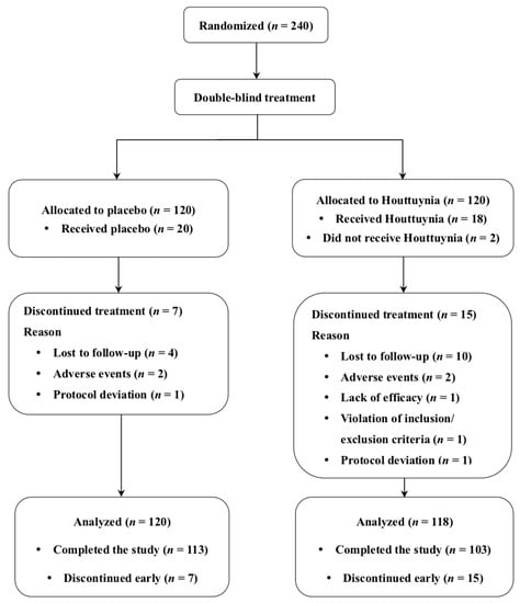 A total of 240 selected patients were randomized for double-blind treatment. Two patients in the Houttuynia group did not take medication, thus 120 and 118 patients in the placebo and Houttuynia groups, respectively, were analyzed. A total of 113 and 103 patients completed all study visits, respectively; this means that seven and 13 patients dropped out from each group for various reasons (Figure 1). The data in Table S3 demonstrate patient clinical characteristics at baseline. These data show no significant differences in demographic characteristics between the placebo and Houttuynia groups, comprising about 75% of women with an average age of about 38 years. Results also show no statistical differences in the data at baseline between the two groups in terms of ocular symptoms as well as in signs of MGD and DED.