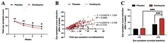 Total and individual ocular symptom scores gradually decreased in both the groups in the following three visits (Figure 2A). There was a statistically significant difference between the two groups in the score reduction of 1 week (p = 0.0002) and 2 weeks (p = 0.0020); results reveal a 6.29 ± 0.55 (p < 0.0001) and 9.00 ± 0.61 (p < 0.0001) reduction in total symptom scores after four weeks of atomization treatment compared with baseline in the placebo and Houttuynia groups, respectively, as well as a statistically significant difference between the two (p = 0.0018) (Table 1). Results for each individual symptom score show that values for the Houttuynia group dropped more than in the placebo group, while reduced values for eye dryness, foreign body sensation, and photophobia were statistically different between the two groups (Table S4).