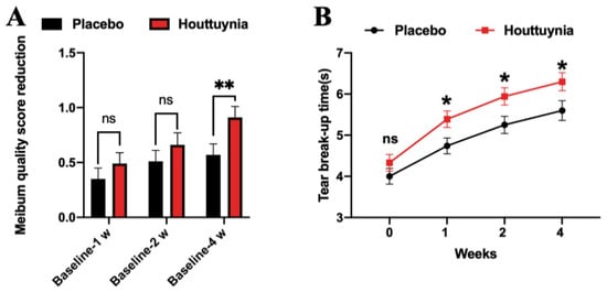 Change in meibum quality and tear break-up time. (A) shows the meibum quality score reduction values after one week, two weeks, and four weeks compared with the baseline. (B) shows tear break-up time at baseline, one week, two weeks, and four weeks. Data are presented as mean ± SEM. * p < 0.05, ** p < 0.01, ns, no significance.