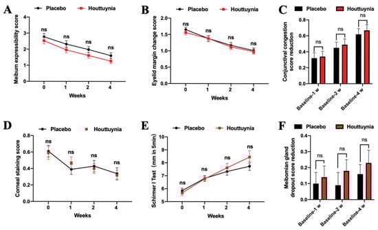 Changes in secondary outcome measures. (A–E) illustrate meibum expressibility scores, eyelid margin change, corneal staining, and Schirmer I test results, respectively. These data are shown at baseline as well as after one week, two weeks, and four weeks. (C,F) show reduction values for conjunctiva congestion and meibomian gland dropout scores after one week, two weeks, and four weeks compared with the baseline. Data at each point are presented as mean ± SEM. ns, no significance.