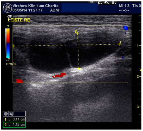 Sonographic imaging of the right inguinal area: anechoic elongated fluid structure 3.47 × 1.15 cm.