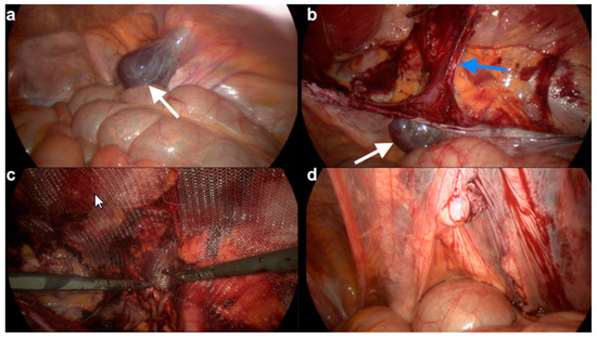 Laparoscopic procedures for hydrocelectomy and TAPP. (a) In the laparoscopic view, a type 2 hydrocele of the canal of Nuck (white arrow) (b) Approach to the inguinal canal and dissection of the hydrocele (white arrow) attached to the round ligament (below blue arrow). (c) Placement of the polypropylene mesh. (d) Sutured peritoneum.