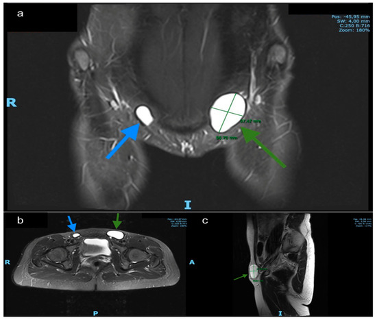 MRI findings. (a) Coronal T2-weighted. (b) axial T2-weighted and (c) sagittal MR images demonstrate a left inguinal hyperintense cystic structure without septation and a smaller (asymptomatic) on the right side. Green arrows: left hydrocele, blue arrows: right hydrocele.