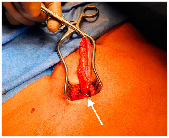 Intraoperative picture of a hydrocele of the canal of Nuck. The round ligament (white arrow).