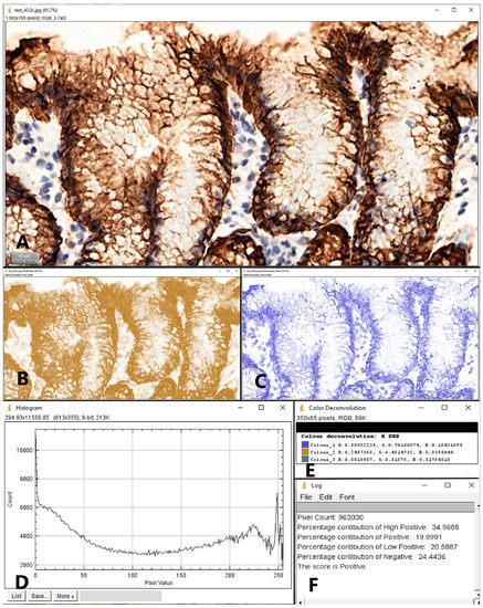 The other pathologist used color deconvolution and pixel profiling for a quantitative analysis. For each of the three mucins, two images were captured at 40× objective magnification (performed with the Case Viewer software), one from the superficial region and one from the glandular region of the antral mucosa. The images were digitally processed with the IHC Profiler plugin for ImageJ (NIH, Bethesda, MD, USA). IHC Profiler is an open source plugin that analyses the pixel intensity and retrieves the percentage contribution of high positive, positive, low positive and negative pixels (Figure 1); using this percentages, an optical density score (ODS) was determined, for each of the two mucosal regions, according to a previously recommended formula [25,26]: