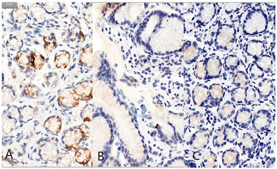 Pediatric studies report different patterns of expression in H. pylori positive patients, ranging from the absence of the aberrant expression of MUC6 and MUC2 [22], to an aberrant nuclear expression of MUC6 and MUC2 in a limited number of cases [32]. Meanwhile, research involving infected adults reports minimal expression of MUC5 in the deep glandular region [33] and an aberrant expression of MUC6 in the surface epithelium [34,35], going as far as 72% of infected adults; these differences may be explained by a longer H. pylori exposure in adult patients [34]. Although not significantly different between the infected and noninfected groups, we observed glandular expression of MUC5AC, foveolar expression of MUC6 and aberrant expression of MUC2 in the gastric epithelium in a limited number of cases. These aberrant expressions, both nuclear as well as the unusual topographic location, should be interpreted with caution, taking into account that the usual expression of mucins is at the cytoplasmic level of the epithelial cells, with a specific topographic distribution within the regions of the gastric mucosa [31].