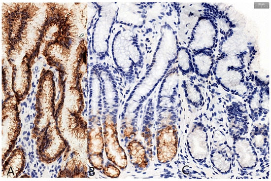Examples of aberrant mucin expression (40× objectiveX): glandular expression of MUC5AC (A), foveolar/superficial expression of MUC6 (B) and glandular expression of MUC2 in the gastric epithelium (C).
