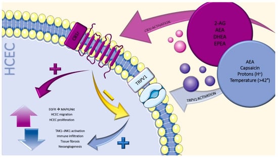 - Yang, Y.; Yang, H.; Wang, Z.; Varadaraj, K.; Kumari, S.S.; Mergler, S.; Okada, Y.; Saika, S.; Kingsley, P.J.; Marnett, L.J.; et al. Cannabinoid receptor 1 suppresses transient receptor potential vanilloid 1-induced inflammatory responses to corneal injury. Cell Signal. 2013, 25, 501–511. [Google Scholar] [CrossRef][Green Version]