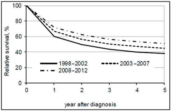 Overall, survival rate improvement was seen in most cancer sites, including colorectal [25]. The present results show that the survival rates of colorectal cancer patients in Lithuania (51.5%) are worse than the rates observed in Northern (Norway, 63.4% and Sweden, 60.3%) and Central European countries (Germany, 61.4% and Denmark, 63% colon and 65% rectal cancer) over similar time periods [5,14,26,27] and other Western countries (e.g., United States, 64.1% and United Kingdom, 53.1%) [28,29].