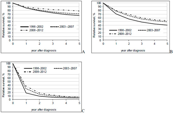 Five-year relative survival by period of diagnosis and extent of disease ((A)—localized; (B)—regional metastases; (C)—advanced).