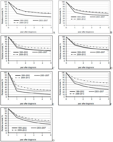 Five-year relative survival by period of diagnosis and extent of disease (A)—caecum and appendix; (B)—right colon; (C)—transversum; (D)—left colon; (E)—other; (F)—rectosigmoid; (G)—rectum).