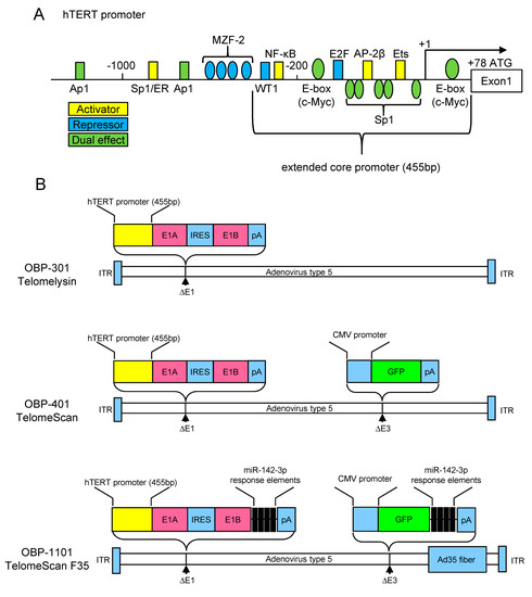 Structures of telomerase-specific replicating adenoviruses. (A) Representative transcription factor binding sites on the human telomerase reverse transcriptase (hTERT) promoter are shown. The sites on the promoter are not to exact scale. +1 indicates the transcription start site. ATG indicates the translation starting codon. (B) In OBP-301, the hTERT extended core promoter drives the expression of E1A and E1B genes linked with internal ribosome entry site (IRES). OBP-401 is a green fluorescent protein (GFP)-expressing variant, in which the cytomegalovirus promoter drives the expression of GFP inserted in the E3 region. In OBP-1101, the adenoviral fibers were replaced with type 35 fibers to enable infection of coxsackievirus–adenovirus receptor-negative cells. The miR142-3p responsive elements were inserted into the 3′ untranslated regions (UTR) of the E1 and GFP genes to attenuate non-specific GFP expression in blood cells. ITR, internal terminal repeat; pA, bovine growth hormone polyadenylation signal; AP1, Activator protein 1; SP1, Specificity protein 1; ER, estrogen receptor; MZF-2, myeloid Zinc-Finger Protein 2; NF-κB, nuclear factor kappa B; c-Myc, c-myelocytomatosis oncogene product; E2F, E2 promoter binding factor; AP-2, Activating enhancer-binding protein-2; Ets, erythroblast transformation specific proteins; GFP, green fluorescent protein; Ad35, adenovirus type 35.