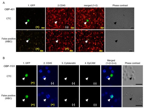 Thirty-seven cases of gastric cancer and several cases of other cancers (e.g., colon, hepatocellular, breast, and lung) were analyzed. The hemolyzed blood samples were infected with OBP-401 and observed using fluorescent microscopy after incubation [74]. This OBP-401-based detection method was also applied for breast [75], bladder [76], and non-small-cell lung cancers [77]. In addition, some modifications have been added to the original protocol. The CTCs in gynecological cancers were analyzed by adding CD45 staining to eliminate false-positive WBCs (described in more detail in Section 5) [46]. The enrichment of the CTC fraction using the OncoQuick® was followed by OBP-401 infection in patients with high-grade glioma [78] and metastatic melanoma [79]. In another experiment, the cell size threshold was applied to the GFP-positive cells in gastric [80,81] and several kinds of cancers, including a small number of gynecological cancers [47].