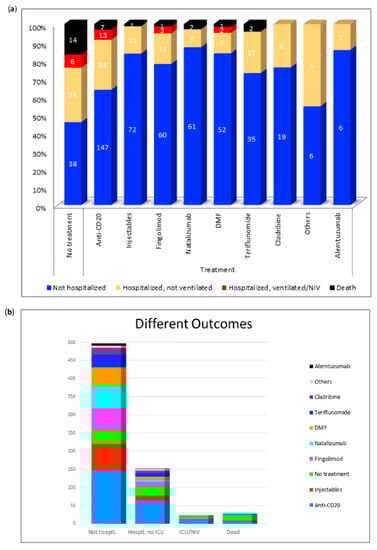 Distribution of the respective outcomes depending on the disease modifying therapies. (a) Distribution of different outcomes per DMT; (b) Number of non-hospitalized, hospitalized, ventilated, and deceased patients. DMF: dimethyl-fumarate; Hospit.: hospitalized; ICU: intensive care unit; NIV: non-invasive ventilation. Others: stem cell therapy (n = 5), immunoglobulins (n = 4), mycophenolate mofetil (n = 3), azathioprine (n = 1), cyclophosphamide (n = 1), methotrexate (n = 1).