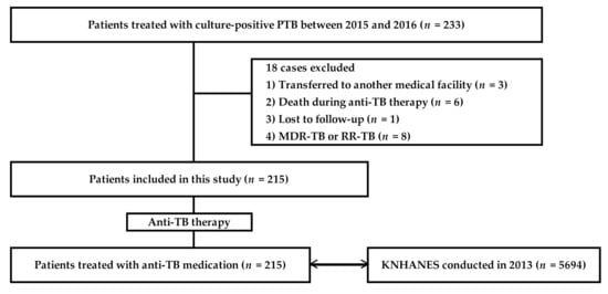 We reviewed the medical records of the patients at our TB clinics. Finally, 215 adult patients with PTB were included in this study (Figure 1).