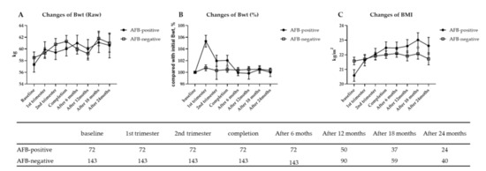 Changes from baseline in body weight (A), % change of body weight compared with baseline (B) body mass index (C) from the time of diagnosis to 2 years follow-up after treatment completion; the observed mean change from baseline over the period of anti-TB therapy in the AFB smear-positive and negative groups. Bwt, body weight; BMI, body mass index; AFB, acid-fast bacilli.
