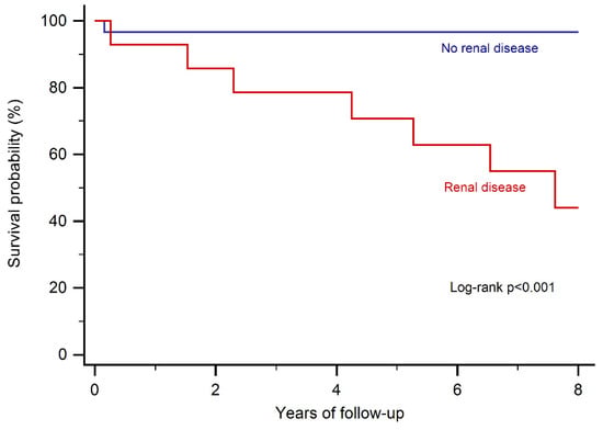 Kaplan–Meier curves stratifying patients according to the presence of renal disease.