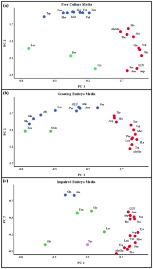 PC analysis of the free culture media (a), and the media containing the growing (b) and impaired embryos (c). Each circle represents different metabolites, wherein the color indicates their relativity. In the free culture media, the essential/conditionally-essential AAs, non-essential AAs, and carbohydrates are in separate groups with strong correlations. Nonetheless, this order is disturbed in the other two media, especially for the impaired embryos, when most of the AAs are correlated together.