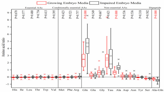 Comparison of the depletion/appearance of AAs by the growing and impaired human embryo media on day 5. This demonstrates the appearance of most non-essential AAs except Ser and the dipeptide of Ala-Gln in a manner that impaired the embryos, which secreted considerably higher levels of Gln and Ala, and consumed a significantly higher amount of Ala-Gln. Significant values have been marked in red above the graph (p value < 0.05).