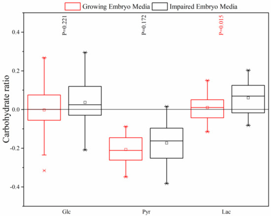 Comparison of the depletion/appearance of Glc, Pyr and Lac by the growing and impaired human embryos on day 5. The inset shows that Lac was significantly different between the growing and impaired embryos. Significant values have been marked in red above the graph (p value < 0.05).
