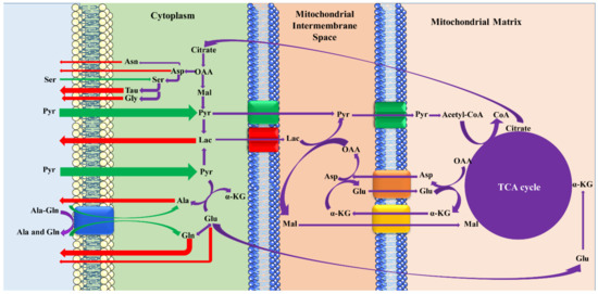 Summary of the proposed mechanism among the metabolites on the fifth day of embryo development. Pyr and Lac transfer through H+-monocarboxylate cotransporters. Ala-Gln may be uptaken within the cells by the AA transporter after hydrolyzation by peptidase into its constituents. Entrance, exit and intercellular interactions of different metabolites have been illustrated in green, red and violet arrows, respectively. TCA: tricarboxylic acid, OAA: oxaloacetic acid, α-KG: α-ketoglutarate, Mal: malate.