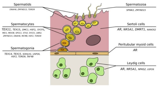 Additional genes involved in spermatogenesis have been also proposed as single molecular causes of NOA, but, in most cases, further functional and/or validation studies are required to confirm the original findings. Some examples include SOHLH1 (spermatogenesis- and oogenesis-specific basic helix-loop-helix protein 1, MIM*610224) [,], USP26 (ubiquitin-specific protease 26, MIM*300309) [,], SYCP3 (synaptonemal complex protein 3, MIM*604759) [], MEIOB (meiosis-specific protein with OD domains, MIM*617670), DNAH6 (dynein, axonemal, heavy chain 6, MIM*603336) [], ZMYND15 (zinc finger MYND-containing protein 15, MIM*614312), TAF4B (TATA box-binding protein-associated factor, MIM*601689) [], SYCE1 (synaptonemal complex central element protein 1, MIM*611486) [], MCM8 (minichromosome maintenance complex component 8, MIM*608187) [], HSF2 (heat-shock transcription factor 2, MIM*140581) [], SPINK2 (serine protease inhibitor, KAZAL-type, 2) [], and TDRD9 (TUDOR domain-containing protein 9, MIM*617963) [], amongst others [] (Figure 1).