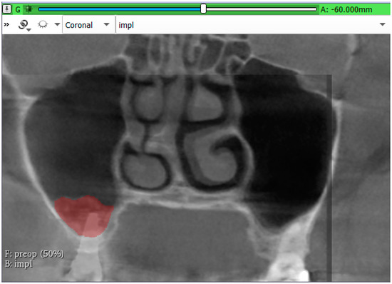 Volume measurement was carried out in the coronal section of fused images by changing the opacity of the layers of the pre- and postoperative CBCT, and—in this specific image—preoperative and 3-year control CBCT data of the same patient.