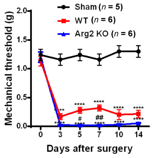 Pain behavioral tests of mice after surgery: The von Frey filament test. Von Frey filament tests were performed repeatedly on days 3, 5, 7, 10, and 14 post-surgery in the sham (n = 5), wild-type (WT; n = 6), and arginase 2 (Arg2) knockout (KO; n = 6) groups of mice. Following spinal nerve transection (SNT) surgery, the pain thresholds of the WT group decreased compared to the sham group. The lowest pain threshold was observed in the Arg2 KO group. Data are presented as means ± standard error of the mean (SEM) (two-way analysis of variance (ANOVA) with Tukey’s post hoc test, F(10,82) = 13.30, **** p < 0.0001 versus Sham; (n = 6), ## p < 0.01, and # p < 0.05 versus WT (n = 6).