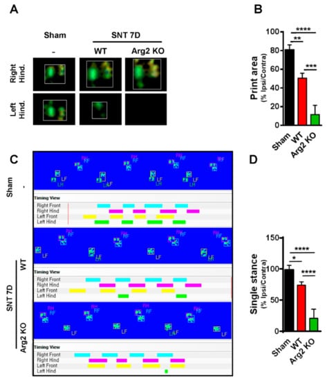 The CatWalk automated gait analysis was used to evaluate gait parameters in the SNT-induced neuropathic pain model. The CatWalk analysis system consists of a glass walkway, which contains light from a white fluorescent source. The light rays from this source exhibit complete internal reflection. When an object touches the glass runway, the light is reflected downwards, where it is detected by a video camera, as the mice travel down a glass-floored walkway located in a darkened tunnel. In general, mice cross the CatWalk runway easily and at a constant speed. The downward pressure of each paw illuminates the fluorescent light from the glass platform, and the video camera detects and records the light signals. Then, CatWalk XT software automatically analyzes various gait parameters, such as paw print area, duty cycle, and the stance phase. In this study, we examined two parameters (print area and single stance, Figures S1 and S2) to study the role of Arg2 in SNT mice. The print area was measured by calculating the surface area contacting the glass floor and the single stance was part of the hind paw step cycle where the contralateral hind paw does not touch the glass plate or where the ipsilateral hind paw touches the glass plate. This signal is then digitized, which allows analysis by the CatWalk program software (CatWalk XT version 10.5.505, Noldus Information Technology, Wageningen, The Netherlands).)