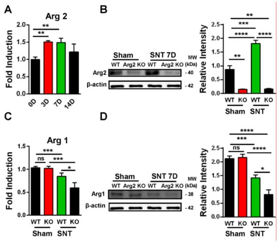 Y.Y. and T.L.P. took part in the design of the study, the experiments of pain behavior, immunoblotting, immunostaining, PCR, and the preparation of the drafted manuscript. J.S. and N.S. performed PCR and immunoblotting. D-W.K. (Dong-Wook Kang) carried out the CatWalk analysis. S.Y.L. and W.L. participated in the design of the study and data analysis. C.-S.K. and S.R.K. analyzed Arg2 mice phenotype. J.H. and D-W.K. (Dong-Woon Kim) performed the design of the study and wrote the manuscript. All authors reviewed the manuscript. All authors have read and agreed to the published version of the manuscript.