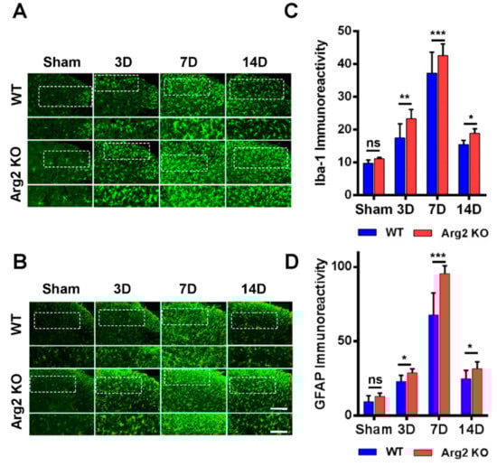 Many studies have demonstrated the modulatory role of microglia and astrocytes in the pathogenesis of neuropathic pain [16,17]. Microgliosis and astrogliosis, which consist of cell proliferation, morphological changes, and activation, are the most common characteristics in the spinal cord following peripheral nerve injury [23]. As a result, the SNT procedure induced microgliosis and astrogliosis in the spinal cords of both groups of mice. We first examined and compared the levels of microgliosis and astrogliosis among the groups by immunohistochemical staining. Figure 4A,B are representative images of microgliosis and astrogliosis respectively, in the ipsilateral spinal dorsal horns of mice from the sham, SNT WT, and SNT Arg2 KO groups. Microglia and astrocytes are commonly activated the most in laminae I and II (the regions shown in the white dotted frames of the upper panels in Figure 4A,B) of the ipsilateral spinal dorsal horn segments L4–L5 following nerve injury. Immunostaining was performed on spinal cord sections on days 3, 7, and 14 post-surgery. No significant microgliosis or astrogliosis was observed in the sham group. In the SNT WT and Arg2 KO groups, we observed the activation of microglia and astrocytes in the spinal cord at every time point. The strongest microgliosis and astrogliosis were recognized on day 7 post-surgery in both groups. Notably, the most robust activation of these cells occurred in the spinal cord of Arg2 KO mice. We also showed the quantification of Iba-1 (microglial marker) and GFAP (glial fibrillary acidic protein, astrocytic marker) immunoreactivities, in comparison with the WT and Arg2 KO at corresponding times (Figure 4C,D), which show larger values for the Arg2 KO group compared to the WT group at every time point and confirmed that the largest values were reached on day 7 post-surgery in each group.