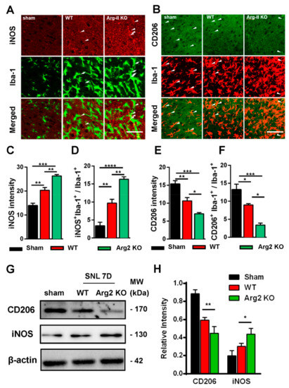 The quantification of iNOS and CD206 expression is shown in Figure 5C–F and is correlated with the immunohistochemical staining images. Figure 5C,D show the upregulation of iNOS immunoreactivity in the spinal dorsal horn, and iNOS+/Iba-1+ co-expressing cells/total Iba-1 expressing cells, respectively. Figure 5E,F illustrate CD206 quantification. Both total CD206 immunoreactivity in the spinal cord and CD206 immunoreactivity in Iba-1-positive cells were downregulated in SNT WT and Arg2 KO mice. For more convincing evidence, we also quantified iNOS and CD206 protein expression in the spinal dorsal horns by western blotting (Figure 5G,H). Consistent with the immunostaining, the western blot results showed an increased iNOS expression from the sham to the Arg2 KO group, whereas CD206 decreased (Figure 5G). In addition, quantification of band intensity of iNOS and CD206 in Figure 5H also served as proof of these modulations. Collectively, iNOS and CD206 were upregulated and downregulated respectively, in SNT mice following surgery. Notably, the greatest number of regulatory changes was found in Arg2 KO mice.