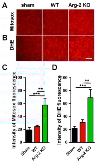 As mentioned above, NO, a metabolic product of L-arginine via iNOS and a subset of ROS, is toxic to cells, and plays a harmful role in inflammatory pathogenesis [28]. ROS describes a number of reactive molecules and free radicals derived from molecular oxygen that are generated during mitochondrial oxidative metabolism [29]. When excess ROS is produced in cells, there is an imbalance between oxidants and antioxidants, resulting in cellular damage, apoptosis, and neuroinflammation, which causes excessive inflammation and neurodegeneration [30]. Thus, we further investigated the level of ROS production in ipsilateral spinal dorsal horns of the three groups of mice. The spinal cord sections were stained with Mitosox (mitochondrial ROS marker) and DHE (cytosolic ROS marker). The results are shown in Figure 6. As expected, the images of spinal cords stained with Mitosox or DHE (Figure 6A,B) show increased production of ROS in both the mitochondria and the cytoplasm of cells in the spinal cords of the SNT mice, compared with the sham mice (control group). The ROS production in the three groups are quantified and compared in Figure 6C,D. Once again, our data revealed that the enhancement of the superoxide formation (ROS production) was strongest in the SNT Arg2 KO mice.