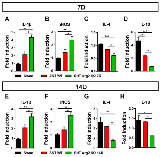It has been well documented that diverse causes of neuropathic pain are associated with excessive inflammation in both the peripheral and central nervous system that may contribute to the initiation and the maintenance of persistent pain [15]. The balance between pro- and anti-inflammatory markers indicates the predominance of M1 or M2 macrophages during the inflammatory process. Inflammatory markers in the spinal cord were assessed via qRT-PCR. We quantified the gene expression of pro-inflammatory markers IL-1β and iNOS, as well as the anti-inflammatory markers IL-4 and IL-10. The qPCR results for these markers (Figure 7A,B) were consistent with our assessments regarding the regulation of inflammatory markers in SNT mice. IL-1β and iNOS levels were upregulated in SNT WT and Arg2 KO mice and the highest levels were observed in the Arg2 KO group. In contrast to IL-1β and iNOS, IL-4 and IL-10, which are produced by M2 macrophages, were downregulated following surgery, especially in Arg2 KO mice (Figure 7C,D). The mRNA levels of these inflammatory markers in the spinal dorsal horn were also assessed at the time point of 14 days post-surgery (Figure 7E–H). These levels remained not significantly different from the levels of day 7 tissues. This means the lack of Arg2 in the KO mice affected both the levels of pro- and anti-inflammatory mediators released in the spinal cord. These data serve as direct evidence for stronger upregulation and downregulation of pro- and anti-inflammatory markers respectively, in the spinal cord of the Arg2 KO mice, after the SNT procedure.