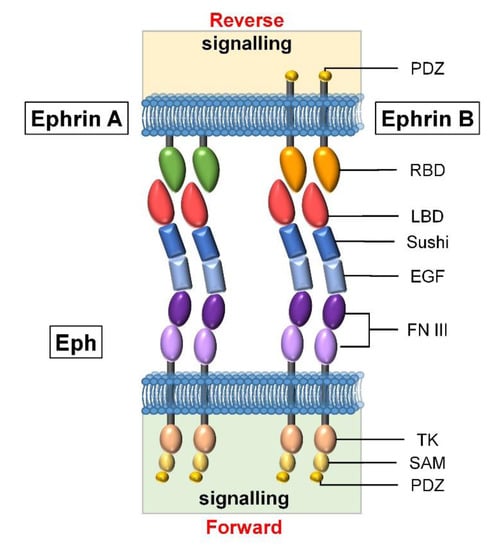 - Kania, A.; Klein, R. Mechanisms of ephrin–Eph signalling in development, physiology and disease. Nat. Rev. Mol. Cell Biol. 2016, 17, 240–256. [Google Scholar] [CrossRef]