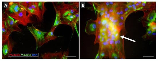 Effects of Eph/ephrin-Fc fusion protein treatment on the morphology of cultured BM-MSCs. (A) Control, Fc protein-treated MSCs attach properly to culture plates showing actin (red) and vimentin (green) filaments arranged throughout cytoplasm. (B) On the other hand, Eph/ephrin-Fc-treated cultures contained cellular masses with numerous nuclei (blue) (arrow) and a less expanded network of actin and vimentin filaments. Scale bars: 50 mm.