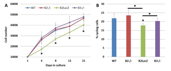 Growth curves and cell proliferation of both WT (wild type) and Eph-B-deficient BM-MSCs. (A) Cell content (×106) of WT and Eph-B-deficient MSCs at different days of culture. Note the significant reduced cellularity of Eph-B2-LacZ MSCs. (B) Percentage of cycling cells in the different cultures. Lower cell proportions occurred in the Eph-B2-LacZ cultures as compared to the other ones (* p value < 0.05) (n = 5).