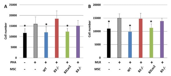Immunomodulatory effects of MSCs on activated splenocytes. Immunomodulation mediated by either WT or Eph-B-deficient MSCs cocultured with activated splenocytes with either PHA (A) or MLR (B). In both experimental conditions, cocultures established with WT or Eph-B2-LacZ MSCs, but not those containing Eph-B2−/− and Eph-B3−/− MSCs, showed significant reduced splenocyte numbers as compared with activated splenocytes cultured alone (gray columns) (* p value < 0.05) (n = 5).