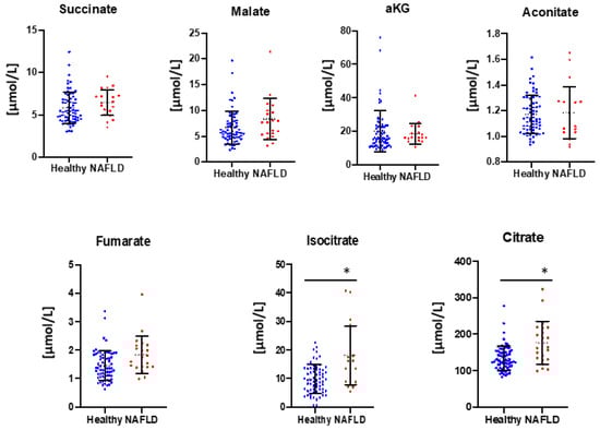 Plasma Krebs cycle intermediates levels by GCMS. Nonalcoholic fatty liver disease (NAFLD) (n = 22) and controls (n = 67). Statistical analysis performed by Prism 8 (GraphPad). * p < 0.05.