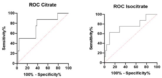 To evaluate isocitrate and citrate performance as mitochondrial dysfunction markers, receiver operating curves (ROCs) were constructed and areas under the curve were calculated. The AUC values indicate that isocitrate and citrate (AUC = 0.74 and AUC = 0.75) have a moderate biomarker performance. However, larger cohorts of control subjects and NAFLD patients can potentially improve these characteristics.