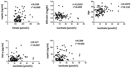 The correlation analysis of the entire population under the study revealed that citrate and isocitrate were correlated with age (range 23–67 years, Figure 3). Citrate was also positively correlated with glucose (r = 0.2839, p < 0.05) and HbA1c (r = 0.3844, p < 0.001). This is similar to a previous report by Shigiyama et al. that showed citrate levels are elevated in NAFLD patients with a high hepatic insulin sensitivity group []. The same study also reported an increase in succinate and aconitate, but we did not find a statistically significant association of these metabolites with glucose in our subjects. However, we noted that aconitate had a strong negative correlation to HDL-C in the control group (r = −0.26, p = 0.03, Supplemental data). We also noted a negative correlation of isocitrate to bilirubin that can be explained by bilirubin being a potent inhibitor of isocitrate dehydrogenase [,].