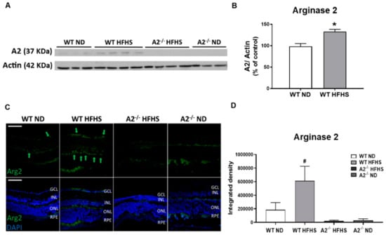 High-fat, high-sucrose (HFHS) diet increased retinal expression of arginase 2 (A2). Representative western blot with quantitation (A,B) showing elevated retina A2 protein levels in wild-type (WT) HFHS group and no A2 expression in arginase 2 knockout (A2−/−) animals (n = 5–6 per group). * p < 0.05 when compared to normal diet-fed (ND) mice within the same genotype. Representative images of immunofluorescent labeling of A2 (green) in retina cross-sections at 20× (C). Green arrows indicate A2 expression locations, scale bar = 50 µm (GCL: Ganglion cell layer, INL: Inner nuclear layer, ONL: Outer nuclear layer, RPE: Retinal pigment epithelium). Quantification of A2 expression in mouse retinas (n = 5 per group) (D), where # p < 0.05 when compared to animals with different genotypes on the same diet.