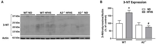 Peroxynitrite (ONOO−) is a reactive oxygen/nitrogen species that nitrates protein tyrosine moieties to produce 3-nitrotyrosine (3-NT). Levels of ONOO− can be assessed indirectly by western blot analysis of 3-NT [30]. Lipid peroxidation, a form of oxidative stress, produces 4HNE, which covalently binds molecules containing amino groups. Western blot analysis showed that retinal levels of both 3-NT and 4HNE were elevated in WT HFHS mice compared to those on the normal diet (Figure 2A–D). Deletion of A2 prevented the HFHS diet-induced increase in these oxidative stress markers (Figure 2B,D).