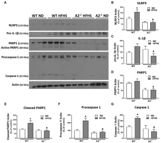Arginase 2 (A2) deletion prevented high-fat, high-sucrose (HFHS) diet-induced inflammasome activation. Representative western blot (A) with quantitation showing the effect of HFHS and A2 deletion on the expression of nucleotide-binding oligomerization domain (NOD)-like receptor pyrin domain-containing protein 3 (NLRP3)) (B), pro-interleukin-1β (pro-IL-1β) (C), poly [ADP-ribose] polymerase 1 (PARP1) (D), active (cleaved) PARP1 (E), procaspase 1 (F) and caspase 1 (G) (n = 5–6 per group). Data are presented as mean ± SEM (standard error of the mean). * p < 0.05 when compared to normal diet (ND)-fed mice of the same genotype, # p < 0.05 when compared to wild-type (WT) mice on the same diet.