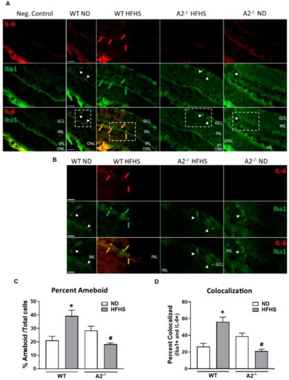 Arginase 2 (A2) deletion prevented high-fat, high-sucrose (HFHS)-induced retinal microglia activation/pro-inflammatory macrophage infiltration. Representative images at 20× (A) and 40× (B) showing immunofluorescent double-labeling of the inflammatory marker, interleukin-6 (IL-6) (red) and microglia/macrophage marker, ionized calcium binding adaptor molecule 1 (Iba1) (green), in retina sections of wild-type (WT) and A2−/− mice fed a normal diet (ND) or HFHS diet (n = 5 per group). Boxes with dashed lines on 20× images illustrate the same section imaged at 40× shown below (B). Red arrows point to regions of IL-6 expression, green arrows point to ameboid microglia/macrophages, and orange arrows point to co-localization of IL-6 and Iba1 (yellow) in ameboid microglia or infiltrating inflammatory macrophages. White arrow heads point to ramified resident microglia. GCL: Ganglion cell layer, IPL: Inner plexiform layer, INL: Inner nuclear layer, ONL: Outer nuclear layer. Scale bars = 50 μm on WT ND images. ImageJ quantification of the number of activated ameboid microglia/macrophages compared to the total number of Iba1 positive cells (C), and the percentage of Iba1 positive cells expressing IL-6 (colocalization) compared to the total number Iba1 positive cells (D). Five randomly selected images per animal were quantified. * p < 0.05 when compared to ND-fed mice within the same genotype, # p < 0.05 when compared to WT on the same diet.