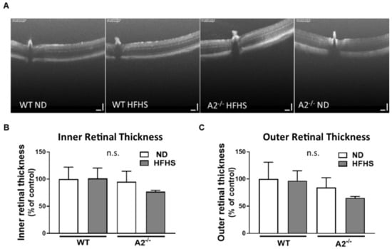 To determine the effect of the HFHS diet and A2−/− on gross retinal morphology and to detect retinal cell loss, the thickness of the inner and outer retinal layers was assessed using optical coherence tomography (OCT). No differences were detected in the thickness of either the inner or outer retinal layers among all the four experimental groups (Figure 5A–C).