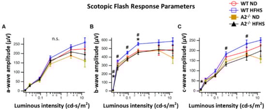 To assess the effect of HFHS diet and A2 deletion on retinal function, dark-adapted (scotopic) and light-adapted (photopic) electroretinography (ERG) was performed. Following overnight dark adaptation, mice were anesthetized using isoflurane and prepared for ERG under dim red lighting. A rectal probe-linked heating pad was used to keep body temperature at 37 °C. Then, proparacaine, tropicamide, and phenylephrine drops were administered to each eye for dilation and topical anesthesia. Silver thread electrodes were placed on each eye and a drop of hypromellose was added to protect the cornea from drying. An optic fiber was then positioned in front of each pupil to deliver visual stimuli, ranging from about 0.018 to 14.4 candela-second/meter2 (cd-s/m2), generated by an LED device (Lightspeed Technologies, Campbell, CA, USA). Experiments were performed using a series of scotopic tests with 5 ms flashes of increasing luminance [18]. For the scotopic flashes, a-, b-, and c-waves were measured conventionally.